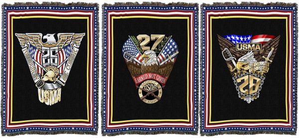 Our Afghan blankets feature the official USMA Class Crests and mottos, beautifully centered on a sleek black background. Each Afghan is bordered with a patriotic design of stars and stripes, making it a striking and meaningful keepsake.